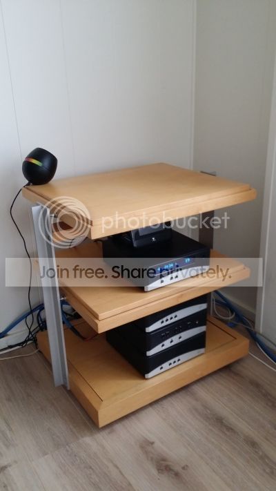 Jullie kunnen zien dat ik geen fotograaf ben en dat ik nog het een en ander moet doen aan kabelmanagement. Ook zou voor het visuele de middelste plank nog iets hoger mogen. Dat vergt echter wel vier handen. Op de bovenste plank komt uiteindelijk de draaitafel.