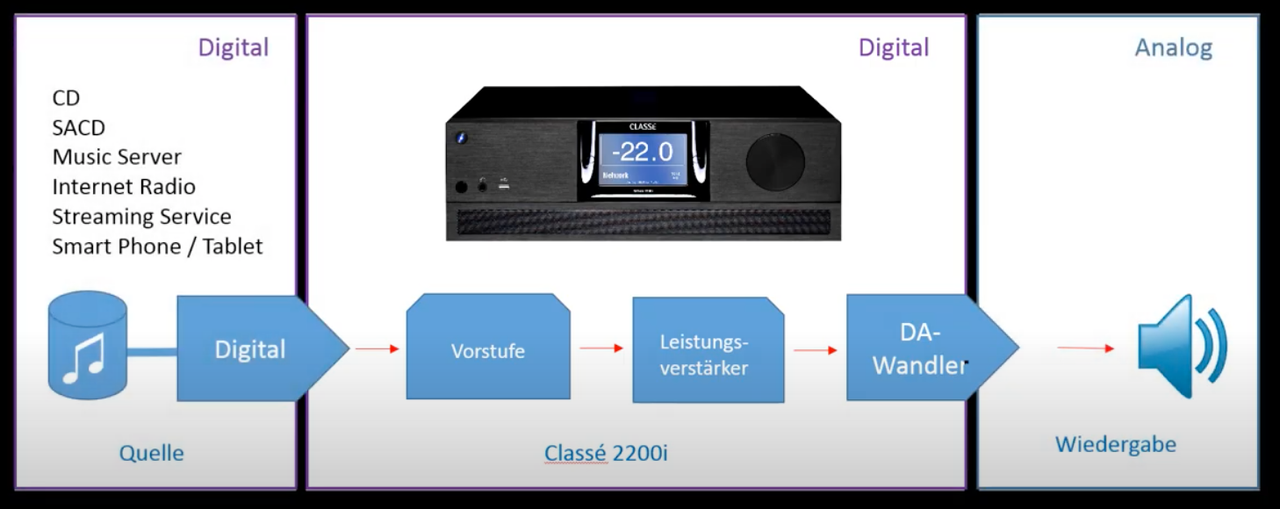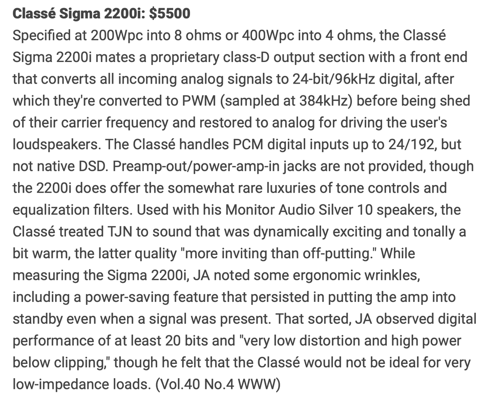 Heb een Classé 2200i. Die zet het analoge signaal van bijvoorbeeld een platenspeler direct om naar digitaal. En pas aan de luidspreker zet hij het weer om naar analoog.