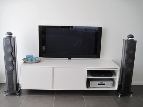 Imposant, hoor. Alleen al die spikes met bijbehorende schotels. Maar staan ze niet een beetje dicht bij de muur? Met drie van die woofers en de rondomstralers zou ik denken dat ruimte rondom wel gewenst is.